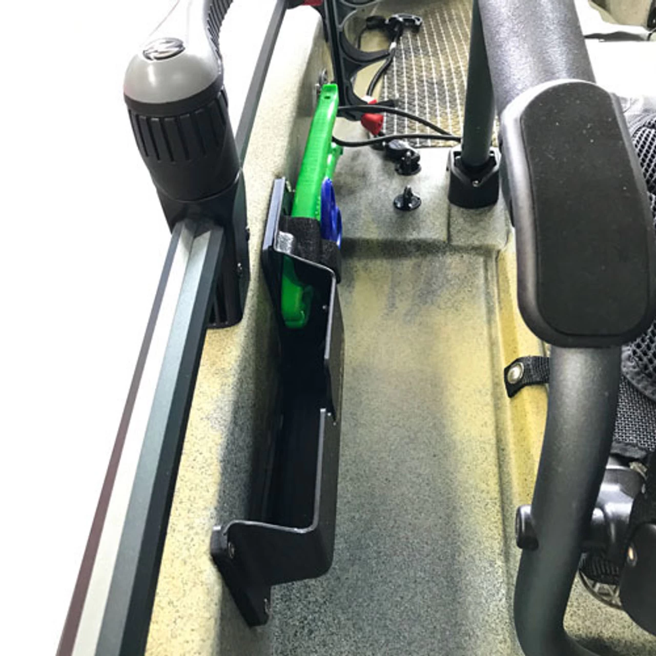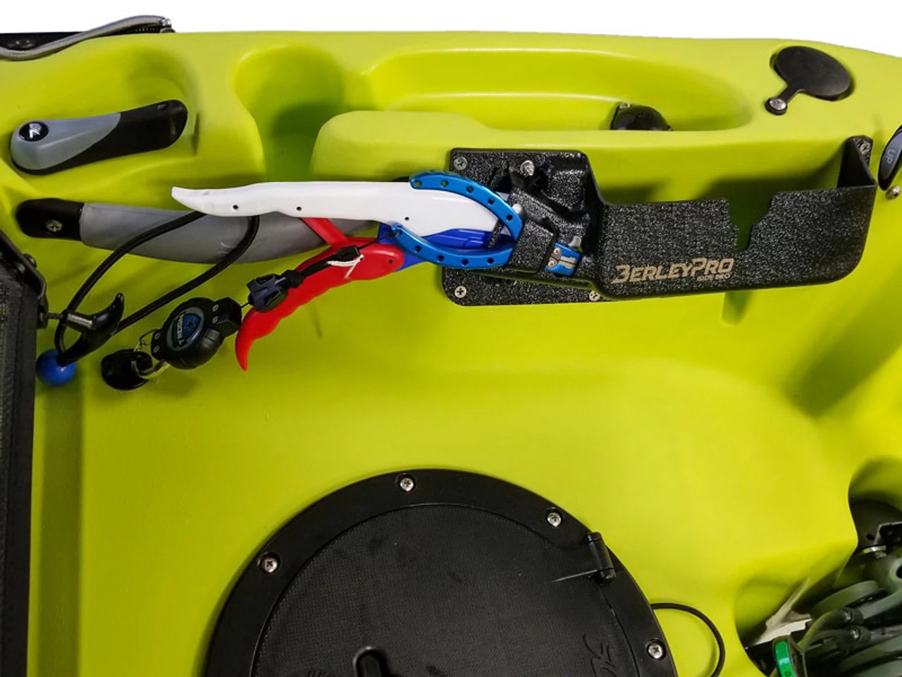 The BerleyPro Side Bro is designed to hold your small red Plano box (Plano Waterproof Stowaway 3440), fish grips, scissors, pliers, and much more. The Side Bro will fit on any flat surface and can be used as a direct replacement for Hobie side pockets.