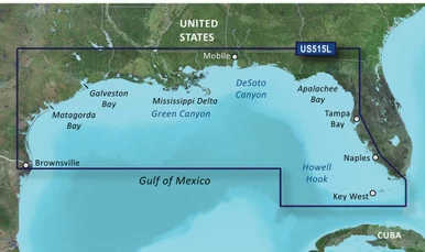 Detailed coverage of the Gulf of Mexico from Brownsville, TX to Plantation Key, FL including Corpus Christi, TX, Matagorda Bay, Galveston Bay, Port Arthur, TX, Atchafalaya Bay, the Mississippi Delta, Chandeleur Islands, Tampa Bay and the Florida Keys west of Key Largo. Also includes Lake Ponchartrain and Lake Maurepas to Vermilion Bay and Lake Calcasieu. Bathymetric coverage of offshore features from Vernon Basin to Alaminos Canyon including DeSoto Canyon, Mississippi Canyon and Green Canyon.