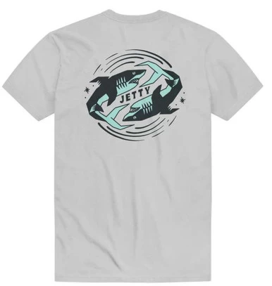 The Jetty Backflip Tee is a short sleeve shirt made with comfortable 60% cotton/40% polyester material. It features a Jetty shark design across the back with smaller version on the front. The design is pigment dyed printed with water based discharge ink. This tee is ultra soft to the touch.