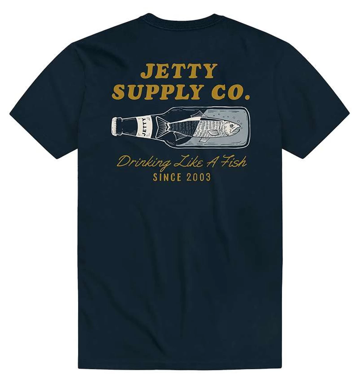 The Jetty Drinkfish Tee is made for you whether you’re drinking like a fish or just catching them. This short sleeve shirt is made with comfortable 100% cotton material. It features Jetty “Drinking Like A Fish” fish in a bottle design across the back with small bottle cap logo on the front. The design is pigment dyed printed with water based discharge ink. This tee is ultra soft to the touch.