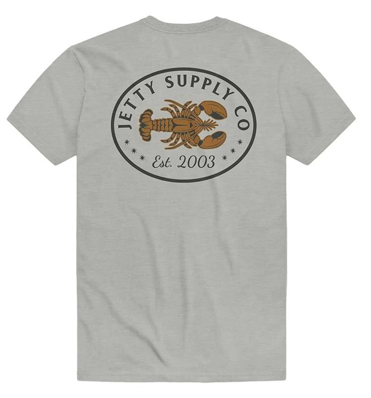 The Jetty Pincer Tee is a short sleeve shirt made with comfortable 52% cotton/48% polyester material and modern tailored fit. It features a Jetty lobster design across the back with smaller version on the front. The design is pigment dyed printed with water based discharge ink. This tee is ultra soft to the touch.