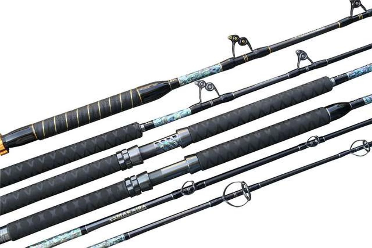 Makaira custom-crafted offshore rods deliver the perfect compliment to the ultimate line up of Makaira and Cedros lever drag reels. Constructed utilizing the latest carbon composite technology, Makaira rods deliver lightweight, easy-handling offshore action that retain the power and durability of traditional E-glass rod blanks. The extensive selection of technique-specific actions utilize the finest components for their intended designs, including: ALPS deep press 316 stainless steel guide frames, hard Zirconium guide inserts, custom designed ALPS reel seats, ALP roller guides with large knot clearance, and much more as you explore the live-bait, deckhand style rods, popping rods and IGFA straight butt and bent butt trolling models. Heavy duty and easily maintained shrink tube grip complete most models, while the premium abalone inserts decorate every rod for a look that has been previously reserved for custom builders.