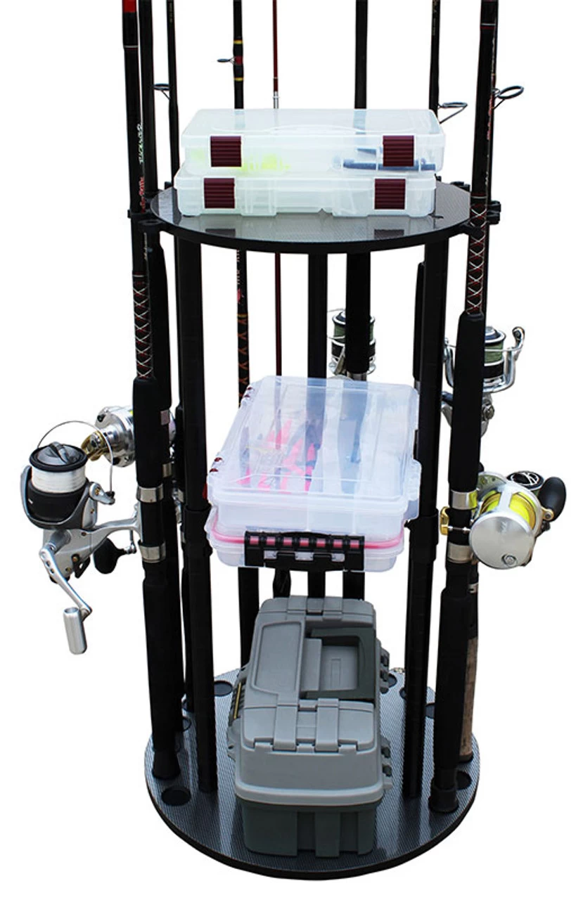 The Rush Creek Creations 17 Rod Round Spinning Storage Rack is made with a heavy duty adjustable wire shelf and is ideal for organizing any angler’s fishing gear and tackle. The base includes the Ultra-Glide Swivel system for a full 360-degree smooth rotation. The 3 tier steel internal leg structure is powder coated for added durability and is scratch resistant. The wire shelf sits in the middle of the rack and can be adjusted to any height between the base and top plate. This rack is designed to hold a variety of utility boxes in different sizes. You will be able to sort crankbaits, spinners, jigs, plastics and other accessories for simple grab and go. The base plate has caps for rod handles. The circular top plate has 17 soft freshwater rod clips that will adjust to any taper. The storage rack was also designed to have easy access to utility boxes.