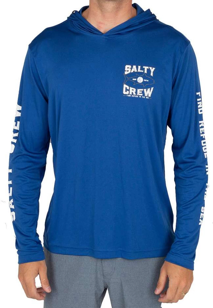 The Salty Crew Tight Lines Hooded Long Sleeve Sun Shirt is great for wearing as a fishing shirt with UPF 40+ sun protection and moisture wicking qualities. This long sleeve shirt features a Salty Crew fish screen printed design on the back with smaller version on the front, and Salty Crew logos down the sleeves. Comfortable layering shirt for warmer weather made with 100% polyester material.