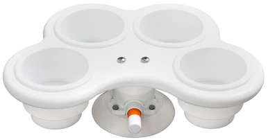 Our new 4-Cup Holder harnesses the power of a 4 1/2″ SeaSucker to hold 4 cans or bottles in foam koozies. Made of 3/4″ starboard with 4 white plastic cup holder inserts, or you can swap out one of the cup holder inserts for a Small Dry Box (a small waterproof storage box for your wallet, cell phone, PDA, etc.) for an extra charge. Horizontal mount – use this cup holder on flat surfaces like your console. Look for our 4-Cup Holder – Vertical Mount for attaching to vertical surfaces.