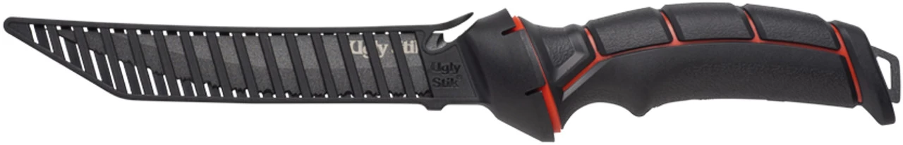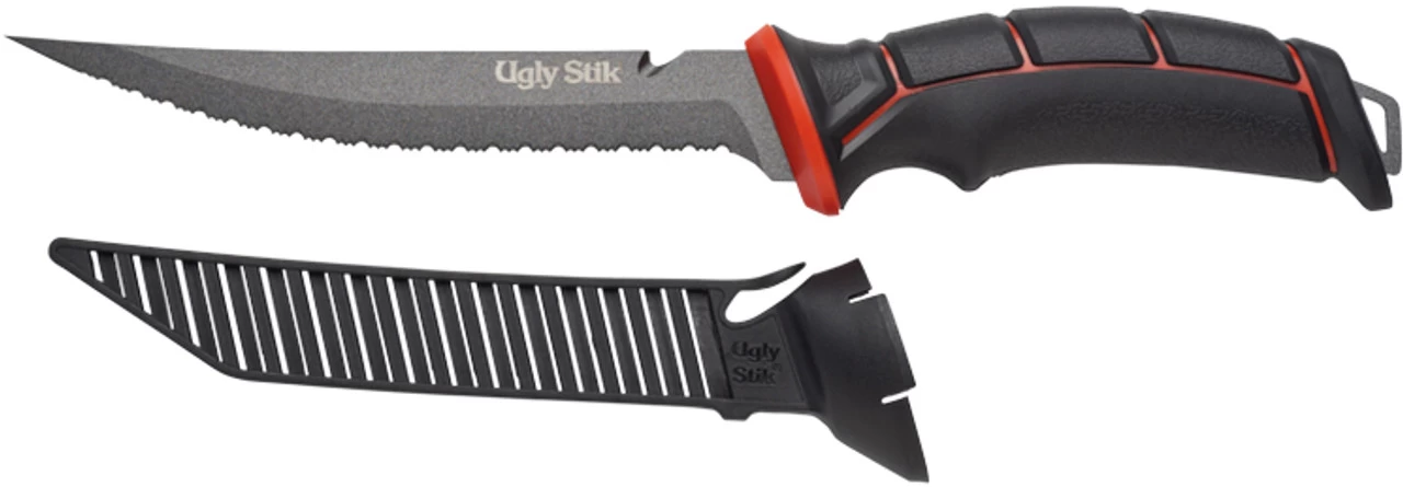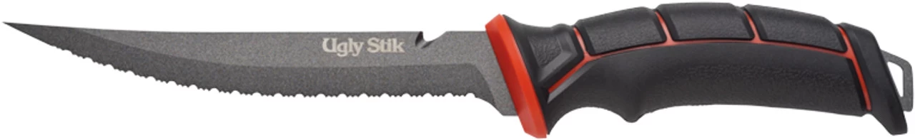 The Ugly Stik Ugly Tools 7 in. Serrated Knife was designed with the angler in mind. This knife features Ugly Tuff Grip, full tang 8CR14 high carbon stainless steel, semi stiff, semi thick serrated blade, and a straight spine with trailing tip and a gut hook tip point. An air-through sheath with line cut access is included.